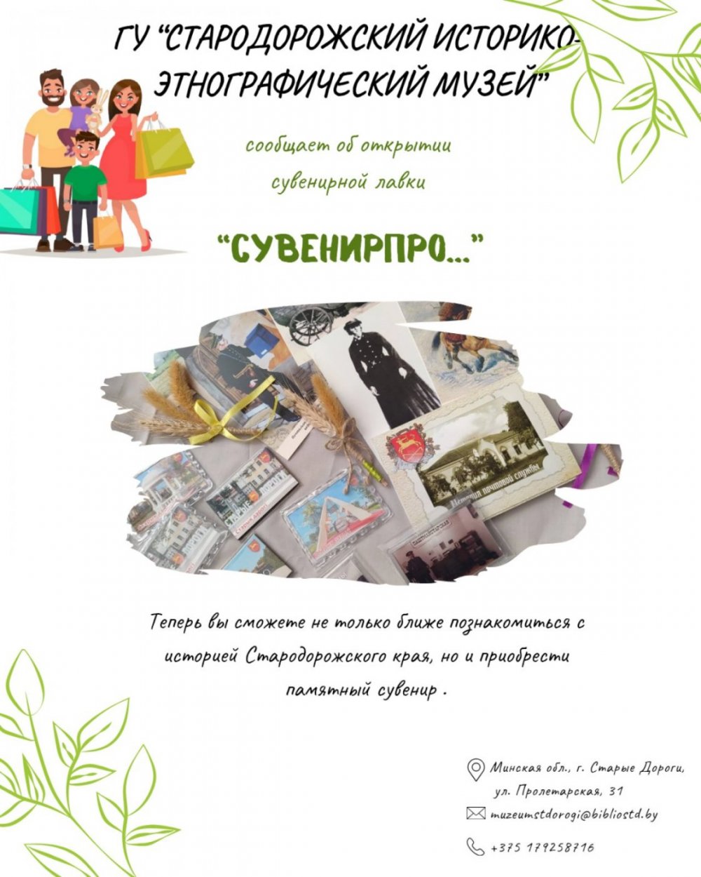 ГУ "Стародорожский историко-этнографический музей" спешит сообщить, что с сентября 2025г. открылась сувенирная лавка "СувенирПро...". Теперь посещение музея станет не только интересным и запоминающимся, но появилась возможность преобрести памятную продукцию.