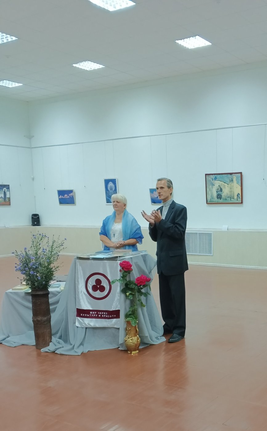 Выставка репродукций картин Николая Константиновича Рериха «Маяки света» из собрания культурно-просветительского общественного объединения «Рериховское общество» работает с 3 сентября. Вчера на ее открытие приехали ее организаторы - Пшонко Андрей Николаевич куратор выставок по Витебской области и Моисеенко Валентина Ивановна, заместитель председателя Витебского отделения Республиканской общественной организации «Русское общество» при посольстве России.
